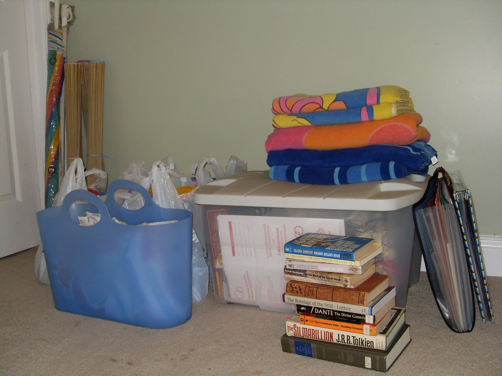 One last tip for organizing a vacation: start early. I usually start putting things in a neat pile in the guest room (or my room) a week or two before our planned vacation dates. I do this as I remember things that aren’t on my original list or as I look at my list and see things that could be set aside ahead of time. This photo is of the pile that I’ve accumulated in our guest room for our impending shore trip.