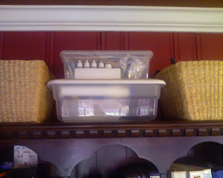 Okay, you’ve got your stuff cleaned out and your containers at the ready. The next step is to fill them! Make sure you put only one type of stuff into each container. For instance, math counters do not belong in the same container with presidential flash cards. Mixing spoons should be separate from Rubbermaid containers. There, wasn’t that fun?! The next step is to label your containers. If you don’t have a labeler, that’s fine. I don’t even have one! (That’s my true confession for the day.) I borrowed a friend’s labeler. You can use masking tape, blank address labels, note cards, or a sharpie right on the container (if it’s plastic or cardboard). Make sure your labels are neat, succinct, and facing in such a way that they’ll be visible when you put the containers on the shelf or stack them.