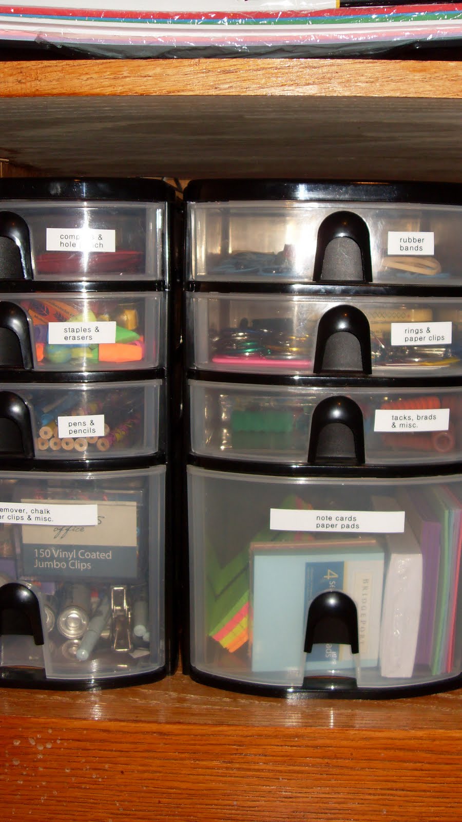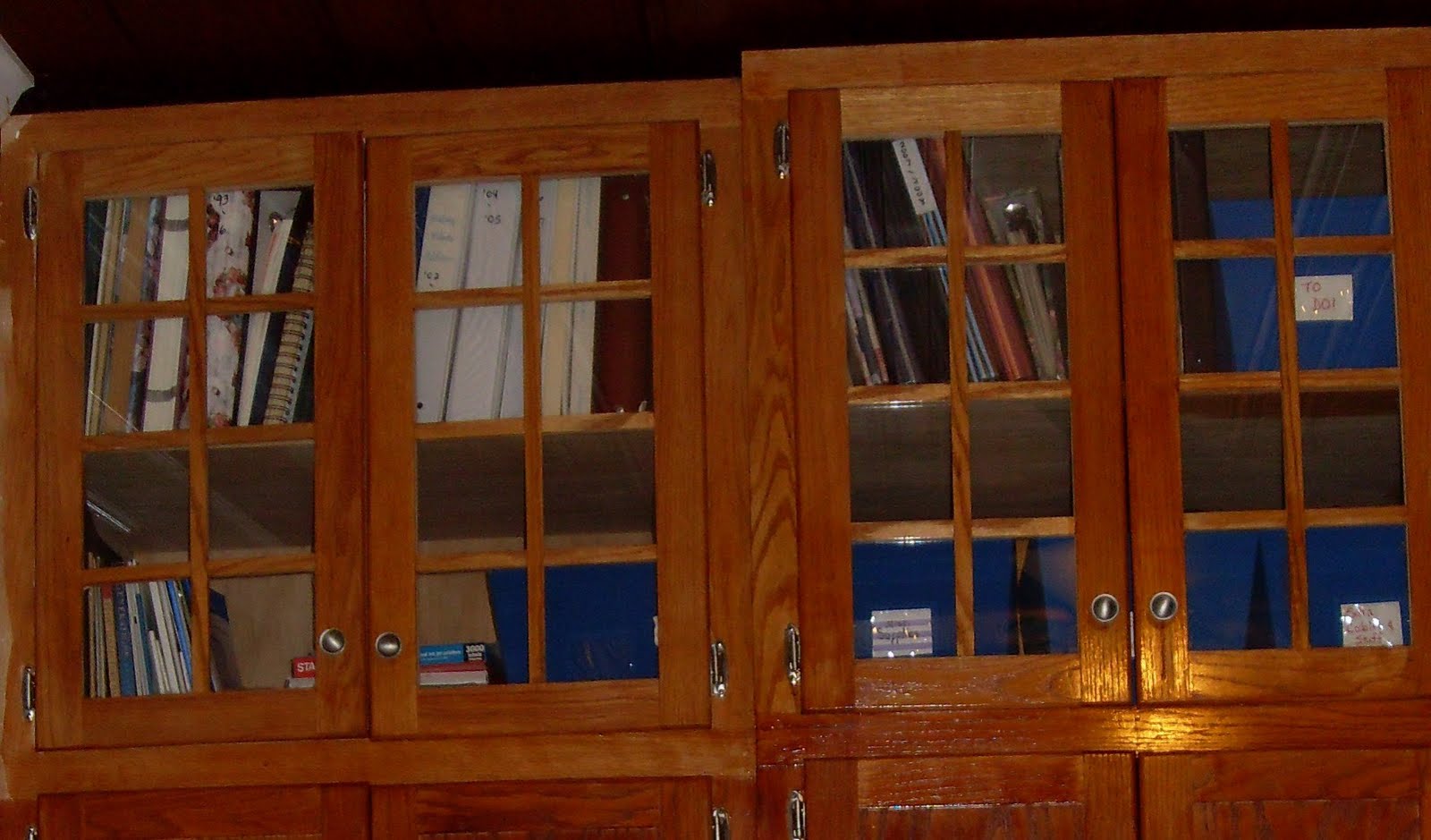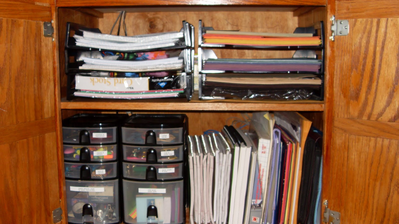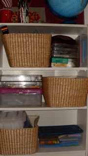 These built-in cabinets came with the house, and I’ve got blank CD-Rs, extra o ffice supplies, stationary, and similar items in the labeled containers.