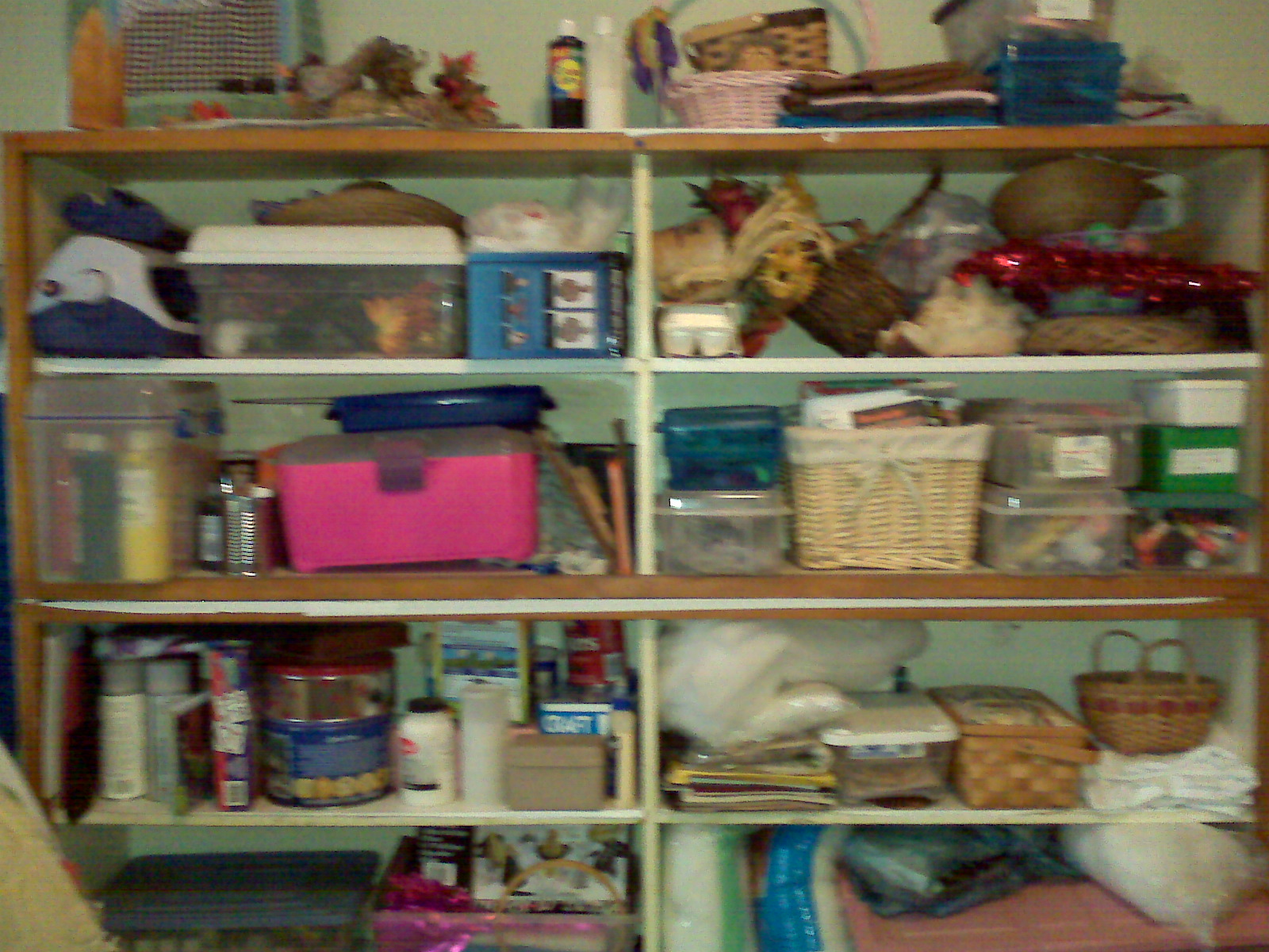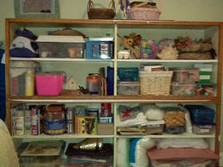 ooked like when I was done with it. I basically put like items together (in containers, and on the same or adjacent shelves, consolidated some things, and threw out the trash. Now, even though it is all neat, I still don’t want my overnight guests to have to look at all of our crafting stuff. So, I took an old quilt my grandmother made me years ago and sewed small, plastic circles on the back. Then I put tacks (cup hooks would be much better) at the same intervals along the top of the shelf and viola, a discreet craft shelf!