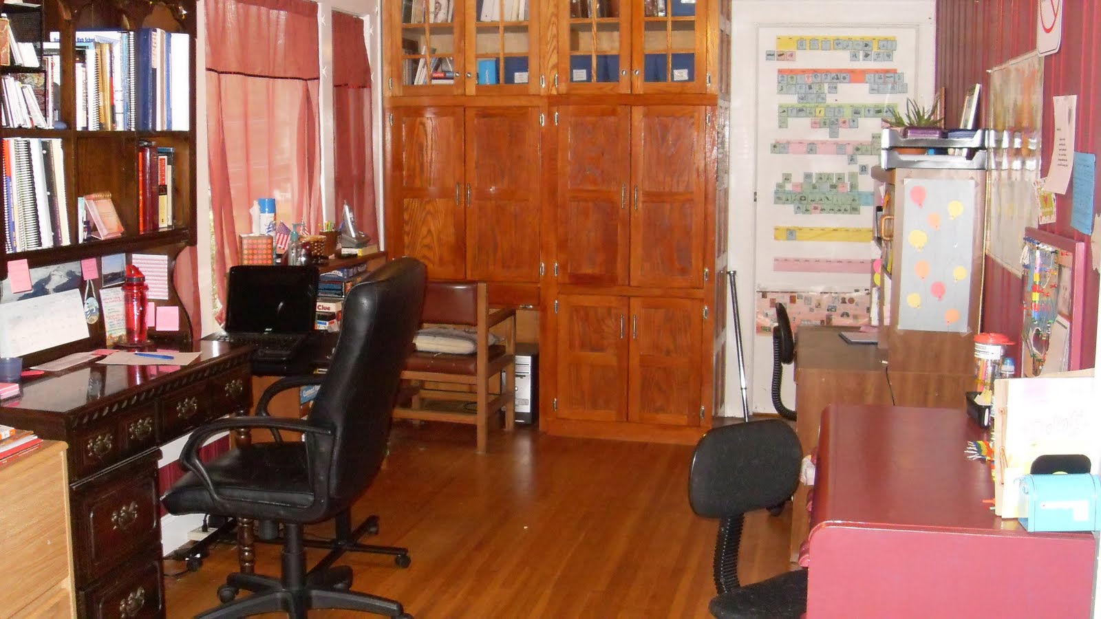 Note that we were able to get rid of one of the desks. That shiny built-in cabinet in the back housed our desktop computer until this past fall, when it died. So, my messy teenager inherited that space (yes–I can close the door on her disaster zone!!), my younger daughter inherited the desk with the hutch, and I kept my desk the same. We’ve got much more floor space and it looks a lot brighter.