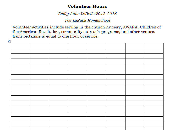 So, I created a table in Microsoft Word with empty blocks to fill in the dates for when my high schooler completes an hour of community or church service time. I hole-punched the paper and keep it in my Mom Master Binder (part 2 here). Then all I have to do is pull it out once every few weeks and update my daughter’s volunteer hours.